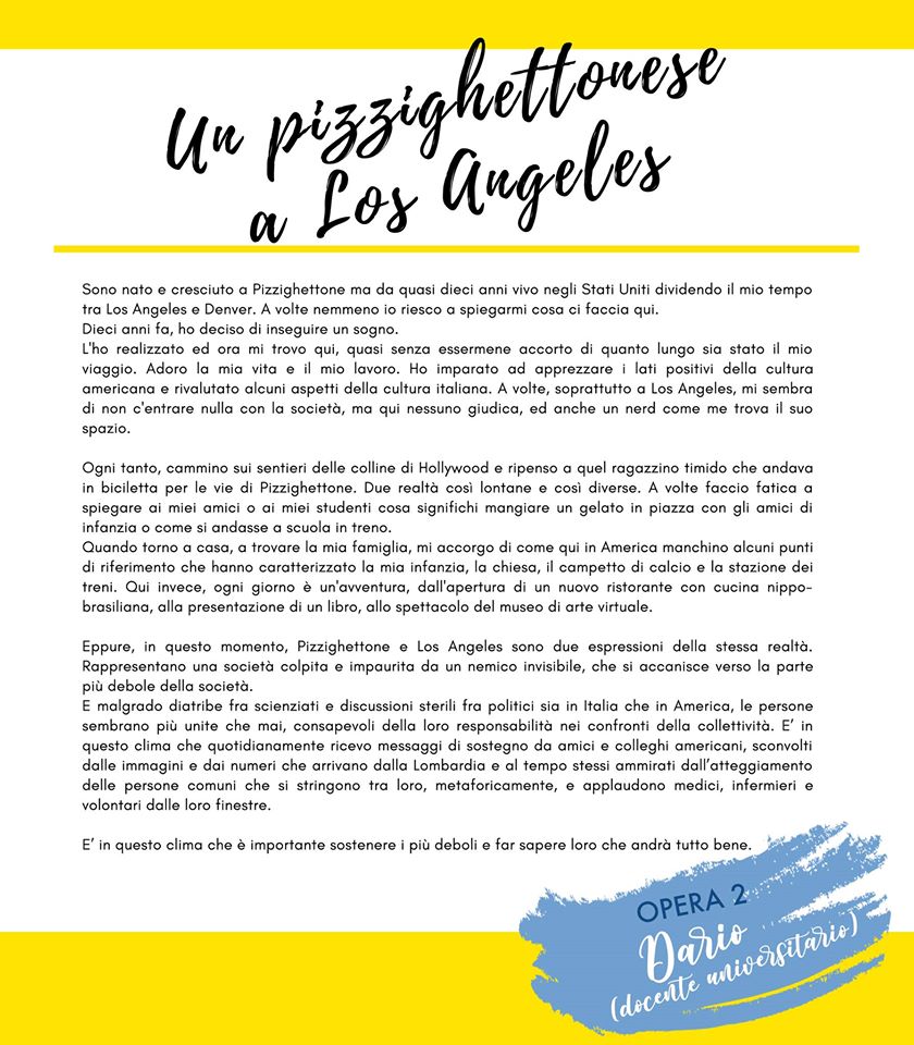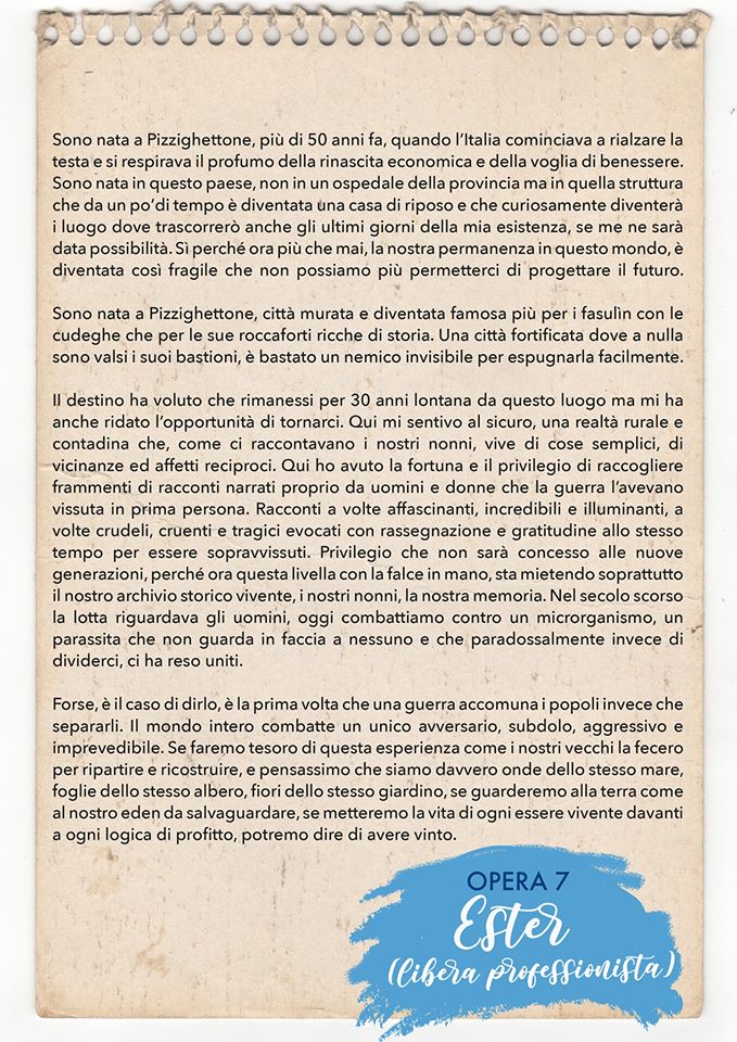 Ci è piaciuto dare spazio ad una giovane studentessa pizzighettonese convinti della bontà del suo progetto e ci auguriamo che molti cittadini, grandi e piccoli, possano aderire in modo trasversale, perché la carica emotiva di questa emergenza ha lasciato segni indelebili in tutta la comunità: dai bambini della scuola dell’infanzia agli adulti, per arrivare alla popolazione più anziana e fragile.