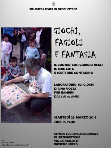 Nel corso dell’incontro Giorgio Reali parlerà dei giochi di un tempo, presenterà alcuni giochi con i fagioli e realizzerà insieme ai bambini dei giochi con la carta. Le attività si terranno parte nel saloncino, parte (tempo permettendo) nel cortile del Centro Culturale.