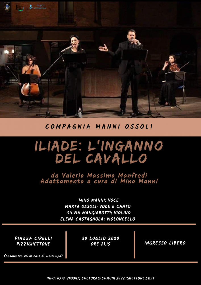 Giovedì 30 luglio alle 21.15 si terrà, in Piazza Cipelli (sul fianco destro della chiesa di San Bassiano) a Pizzighettone, il recital con musica dal vivo Iliade. L’inganno del cavallo.