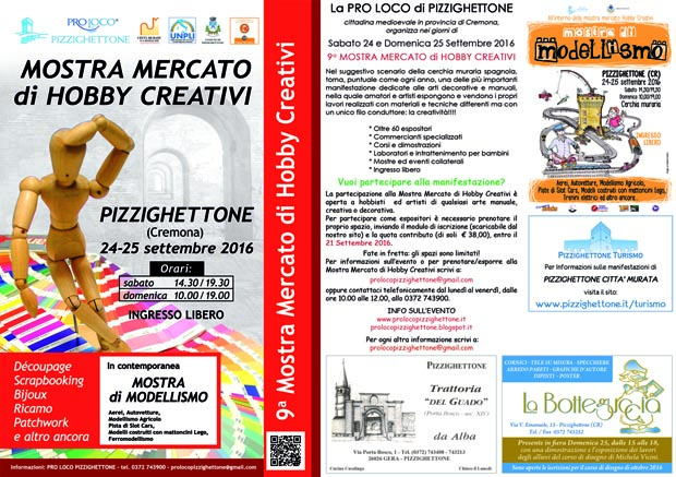 Sabato 24 e Domenica 25 settembre torna la Mostra Mercato di Hobby Creativi. La cerchia muraria di Pizzighettone si riempirà di colori con il tradizionale appuntamento per gli appassionati delle arti creative.
