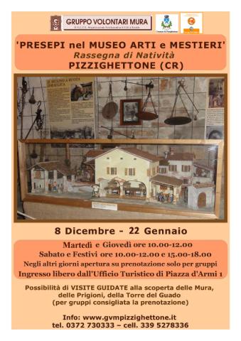 Torna nelle mura di piazza D'Armi la ‘6^ Mostra Presepi nel Museo’, rassegna di natività natalizia allestita nel Museo Arti e Mestieri di una Volta (struttura museale ricavata all’interno delle Casematte delle Mura di piazza D’Armi), organizzata dal Gruppo Volontari Mura Pizzighettone (Cr), col duplice obiettivo di mantenere viva la tradizione del Presepe a Pizzighettone e nel contempo di avvicinare adulti e soprattutto giovani e bambini al Museo. Una struttura museale ricavata nelle casematte delle mura di piazza D'Armi, che mette in vetrina un suggestivo ed istruttivo circuito didattico con quasi 3 mila pezzi esposti di epoca compresa tra l’ottocento e i primi Anni Cinquanta, che raccontano l’evoluzione dell’attività lavorativa a Pizzighettone da artigianale in industriale con la conseguente scomparsa di antichi mestieri. Il Museo Arti e Mestieri di una Volta è suddiviso in quattro sezioni: il Fiume, con le varie attività ad esso legate (navigazione, raccolta della ghiaia e soprattutto la pesca, un tempo unico mezzo di sostentamento per molte famiglie); la Campagna e le Fibre Tessili in cui vengono illustrati i mestieri legati all’agricoltura e alla lavorazione del lino e della canapa, quest’ultima utilizzata nella corderia militare per la produzione di corde e reti di mascheramento. La Trasformazione delle Materie, con la lavorazione del ferro, del legno e del latte, quest’ultima lavorazione destinata al formaggio grana rappresentata in un autentico casello scoperto all’interno della casamatta. La Vita Quotidiana con la rappresentazione dei mestieri artigianali legati alla forte presenza militare, come la sarta, il ciabattino, il sellaio, ecc.