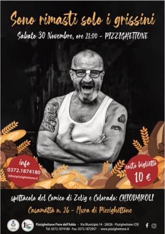 - sabato 30 novembre ore 21:00 Casamatta 26, da Zelig e Colorado, spettacolo comico: ...raffinato ed elegante; moderato e....ehmmm innamoratissimo della sua bellissima PIERAAAAAAA, sarà nostro ospite Chiodaroli! Risate assicurate! Ingresso € 10. Posti a sedere limitati! per info: Tel. 0372 1874180 oppure info@pizzighettone.it