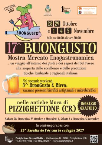 'BuonGusto' (28-29 Ottobre e 1 Novembre) è una ricca e collaudata vetrina per un viaggio all’interno delle eccellenze locali e dei sapori tipici lombardi e regionali italiani a cui nel secondo weekend (4 e 5 Novembre) si affiancheranno anche birrifici artigianali e micro birrifici dando vita a 'BuonGusto & Birra' che avranno così l'occasione di farsi conoscere e di promuovere le rispettive produzioni alle migliaia di visitatori che ogni anno affollano la mostra mercato. La rassegna porta lungo il suggestivo circuito espositivo delle storiche Casematte delle Mura (antichi ambienti a volta di botte all’interno delle mura) e nelle aree esterne adiacenti, espositori selezionati provenienti da tutta Italia (artigiani, consorzi di tutela, produttori, aziende agricole, vitivinicole, birrifici e commercianti specializzati del settore) e produttori locali per proporre il meglio delle rispettive produzioni nel settore agroalimentare, gastronomico, vitivinicolo e, nel secondo weekend, birrifici artigianali, offrendo così al visitatore l'opportunità di conoscere da vicino, degustare ed acquistare le eccellenze italiane e locali. La rassegna, ad ingresso gratuito per il pubblico, si svolge in contemporanea con la 25^ edizione dei ‘Fasulin de l’òc cun le cudeghe’, degustazione del piatto tipico pizzighettonese delle solennità dei defunti e di altre specialità locali che il Gruppo Volontari Mura porta in tavola all’interno delle antiche mura riscaldate da grandi camini d’epoca.