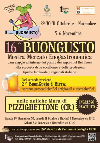 'BuonGusto' (29-30-31 Ottobre e 1 Novembre) è una ricca e collaudata vetrina per un viaggio all’interno delle eccellenze locali e dei sapori tipici lombardi e regionali italiani a cui nel secondo weekend (5 e 6 Novembre) si affiancheranno anche birrifici artigianali e micro birrifici dando vita a 'BuonGusto & Birra' che avranno così l'occasione di farsi conoscere e di promuovere le rispettive produzioni alle migliaia di visitatori che ogni anno affollano la mostra mercato. La rassegna porta lungo il suggestivo circuito espositivo delle storiche Casematte delle Mura (antichi ambienti a volta di botte all’interno delle mura) e nelle aree esterne adiacenti, espositori selezionati provenienti da tutta Italia (artigiani, consorzi di tutela, produttori, aziende agricole, vitivinicole, birrifici e commercianti specializzati del settore) e produttori locali per proporre il meglio delle rispettive produzioni nel settore agroalimentare, gastronomico, vitivinicolo e, nel secondo weekend, birrifici artigianali, offrendo così al visitatore l'opportunità di conoscere da vicino, degustare ed acquistare le eccellenze italiane e locali. La rassegna, ad ingresso gratuito per il pubblico, si svolge in contemporanea con la 24^ edizione dei ‘Fasulin de l’òc cun le cudeghe’, degustazione del piatto tipico pizzighettonese delle solennità dei defunti e di altre specialità locali che il Gruppo Volontari Mura porta in tavola all’interno delle antiche mura riscaldate da grandi camini d’epoca e trasformate per l’occasione in una grande osteria di un tempo con 1.000 posti a sedere che richiama ogni anno migliaia di buongustai e camperisti da tutta Italia. Oltre 60 quintali di Fasulin, pari a circa 18 mila porzioni, e molti altri prodotti tipici dell'autunno contadino.