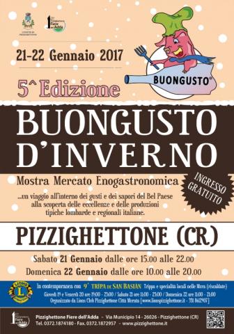 Torna in occasione della solennità patronale di San Bassiano Sabato 21 e Domenica 22 Gennaio 2017 nelle mura di via Boneschi, lungo un circuito espositivo interamente al coperto, la 5^ edizione di ‘BuonGusto d’Inverno’, rassegna enogastronomica promossa da Pizzighettone Fiere dell’Adda con l’obiettivo di riproporre anche durante il periodo invernale l’ormai collaudata e molto apprezzata mostra mercato ‘BuonGusto’ autunnale.