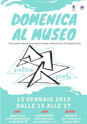 Domenica 13 gennaio 2019 si terrà la terza Domenica al Museo dell’anno scolastico in corso. Questa volta partiremo dalle collezioni per approdare alle sensazioni che ci danno e che trasformeremo in … Sculture di parole.Perché un museo non è solo fatto di oggetti, ma anche di impressioni e stati d’animo che cercheremo di identificare e tradurre in forme e parole. Quindi, spazio all’immaginazione! Le Domeniche al Museo sono organizzate da Museo Civico e Informagiovani di Pizzighettone allo scopo di avvicinare i bambini e le loro famiglie ai musei. Età consigliata: 5-10 anni. Non è richiesta prenotazione, ma verranno accettati trenta bambini al massimo. Ingresso libero.