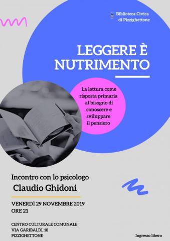 Venerdì 29 novembre alle 21, presso il Centro Culturale Comunale di Pizzighettone si terrà la conferenza Leggere è nutrimento. La lettura come risposta primaria al bisogno di conoscere e sviluppare il pensiero. Relatore dell’incontro, organizzato dalla Biblioteca Civica, sarà il dottor Claudio Ghidoni, psicologo, direttore dell’Istituto Alfred Adler di Milano.