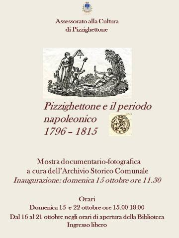 Domenica 15 ottobre 2017 alle ore 11.30, presso il Centro Culturale Comunale di Pizzighettone verrà inaugurata la mostra documentario - fotografica Pizzighettone e il periodo napoleonico. 1796 – 1815. L’esposizione consiste in una serie di pannelli informativi, riassuntivi del periodo napoleonico che ha interessato l’Italia, con particolare riguardo alla partecipazione e all’influenza avuta nel Comune di Pizzighettone.