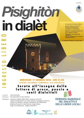 Il 17 Gennaio 2018 si svolgerà in tutta Italia la sesta edizione della Giornata Nazionale del Dialetto e delle Lingue Locali e, a tal proposito, la Pro Loco di Pizzighettone ha voluto aderire, come ormai da tradizione, a questa iniziativa nazionale dell’UNPLI – UNIONE NAZIONALE PRO LOCO D’ITALIA organizzando una serata all’insegna del divertimento e della cultura dedicato alla lettura di prose, poesie e canti dialettali denominata: “Pisighitòn in dialèt”.