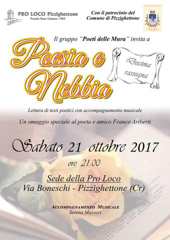 Sabato 21 ottobre alle ore 21.00 presso la Polveriera San Giuliano, sede della Pro Loco, si terrà la X^ Edizione della Rassegna POESIA e NEBBIA - Lettura di testi poetici con accompagnamento musicale, organizzata dal Gruppo "Poeti delle Mura" in collaborazione con la Pro Loco di Pizzighettone. Un omaggio particolare sarà dedicato al poeta e amico Franco Ariberti recentemente scomparso. Ingresso libero.
