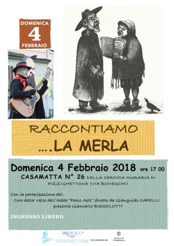 La Pro Loco, con il patrocinio del Comune, organizza per domenica 4 Febbraio alle ore 17.00, lo spettacolo musicale, e non solo, “RACCONTIAMO…LA MERLA” all’interno della casamatta 26 della Cerchia Muraria Pizzighettone (locale riscaldato).