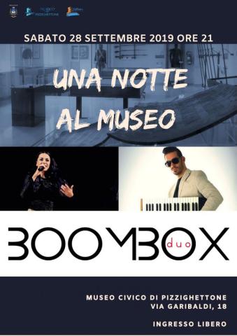 Sabato 28 settembre alle 21, presso il Museo Civico di Pizzighettone si terrà Una Notte al Museo, dedicata all’esibizione del duo acustico BOOMBOX.L’iniziativa si inserisce nel Settembre pizzighettonese, un progetto ideato da Pro Loco e dedicato a vari eventi, compreso quello che si svolgerà in Museo e che nasce da una collaborazione tra Pro Loco e Museo Civico.